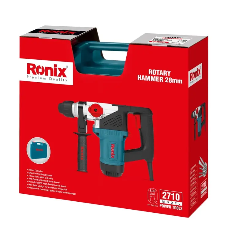بتنکن 28 میلیمتری 2710 رونیکس، مجهز به موتور گیربکسی و قدرتمند 900 وات است که سرعتی بالغ بر 980 دور بر دقیقه و تعداد ضربات BPM 3850 را ایجاد میکند. مجموعه ابزارگیر چهارشیار این دستگاه، به ظرفیت 28 میلیمتر و مناسب برای سطوح چوبی، فلزی و بتنی طراحی شده است.