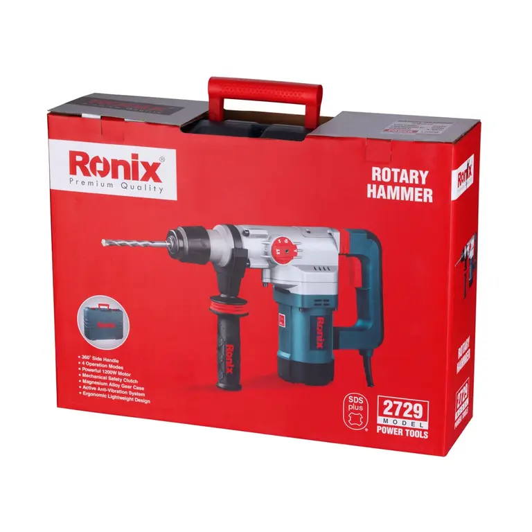 بتنکن برقی 2729 رونیکس، مجهز به یک موتور قدرتمند 1200 واتی است؛ موتوری متشکل از آرمیچر و بالشتک صنعتی که با دستگاههای تمام اتوماتیک تولید شده و سرعتی بالغ بر 1000 دور در دقیقه را تولید میکند. سیستم ابزارگیر این بتنکن از نوع SDS-PLUS یا چهارشیار انتخاب شده است و میتواند متههایی با قطر 28 میلیمتر را ثابت نگه دارد.
