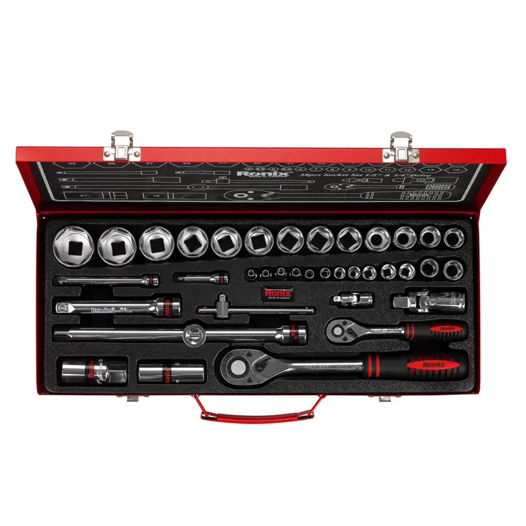 جعبه بکس RH-2638 رونیکس یک مجموعه کامل و حرفهای شامل 38 قطعه مختلف با درایوهای 1/2 اینچ و 1/4 اینچ است که تمامی قطعات آن از آلیاژ فولاد کروم-وانادیوم ساخته شدهاند. این مجموعه دارای روکش شفاف آیینهای بوده و به روش فورج و حرارتدهی شده، مقاومت بالایی در برابر رطوبت، خوردگی، تغییرات دما، خمش و پیچش دارد.