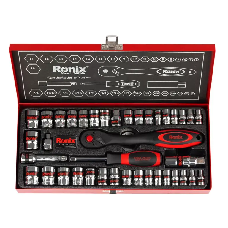 مجموعه بکس 40 عددی 3/8 اینچ دسته TPR رونیکس مدل RH-2640مجموعه ‌ای دارای 40 قطعه، ساخته شده از مواد باکیفیت سخت‌ کاری شده با گشتاور بالا می باشد. این ست دارای سوکت‌ های فولادی از جنس کروم وانادیوم با مقاومت و استحکام بالا است که با کروم مات مشکی روکش شده ‌اند تا در برابر زنگ‌ زدگی و خوردگی مقاوم باشند. لبه‌ سوکت ‌ها در این محصول به دقت تراش خورده اند که این ویژگی با ایجاد اندازه ‌های دقیق و انتهای مورب در سوکت ‌ها، قرار دادن بکس بر سطح کار را آسان نموده و از خود دستگاه و سطح کار در برابر آسیب حاصل از لبه ‌های تیز سوکت محافظت می‌ کند.