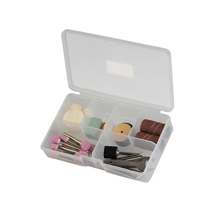ده عدد چرخ سنگ زنی با شفت 3.2 میلی متری، یک عدد شفت سنباده 3.2 میلی متری، دو عدد سنبه 3.2 میلی متری، دو عدد مته 2.3 میلی متری و 3.2 میلی متری، دو عدد مته الماس 3.2 میلی متری، یک عدد آچار، دو عدد کولت 2.3 میلی متری و 3.2 میلی متری، هشت عدد سنگ برش، سه عدد نوار سمباده، چهار عدد نمد، یک عدد سنگ آهن، چهار عدد نوار سمباده، یک عدد محور (شلنگ) منعطف |